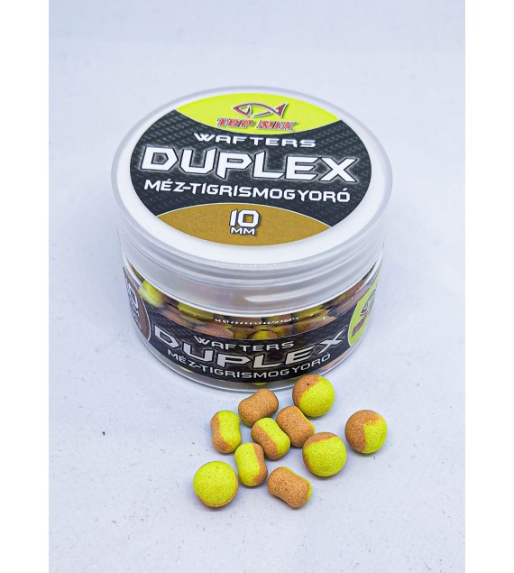 A Top Mix Duplex wafters termékcsalád tagjai azoknak a feeder horgászoknak készültek, akik szeretik az attraktív oldódó csalikat. Kikönnyített pelletek, de épp csak annyira, hogy fine tüske mellett #14 horgokkal is használhatók legyenek a legkisebb, 8-as méretek. 8mm, 10mm és 12mm méretekben kapható minden íz. Oldódási képessége intenzív, "nyitott csali", hogy az aroma mellett beltartalmi értéke is csalogassa az oda tévedő halakat. Dupla színösszeállítás mellett ugyanazzal a csalival különböző fényviszonyok mellett is horgászhatunk, egyszerűen a másik oldalról tűzzük fel a csalinkat, máris más tónusú, de ugyanolyan színvilágú csalink lesz a horog mellett.