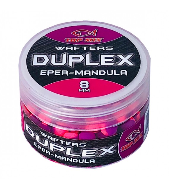 A Top Mix Duplex wafters termékcsalád tagjai azoknak a feeder horgászoknak készültek, akik szeretik az attraktív oldódó csalikat. Kikönnyített pelletek, de épp csak annyira, hogy fine tüske mellett #14 horgokkal is használhatók legyenek a legkisebb, 8-as méretek. 8mm, 10mm és 12mm méretekben kapható minden íz. Oldódási képessége intenzív, "nyitott csali", hogy az aroma mellett beltartalmi értéke is csalogassa az oda tévedő halakat. Dupla színösszeállítás mellett ugyanazzal a csalival különböző fényviszonyok mellett is horgászhatunk, egyszerűen a másik oldalról tűzzük fel a csalinkat, máris más tónusú, de ugyanolyan színvilágú csalink lesz a horog mellett.
