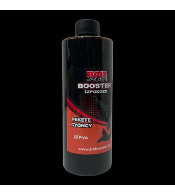 A Bait Maker csaligyártó cég, legújabb fejlesztéseinek egyik terméke a Booster, mely egy íz- és színfokozó, locsoló folyadék. Erős ízt és színhatást kölcsönöz a bojliknak, pelleteknek, etetőanyagoknak, mag mixeknek, stick mixeknek, ezzel növelve csalink, vagy etetésünk vonzerejét a halak számára. Rendkívül tömény, erős illatú, ízű folyadék, ezért kevés is elég a hatás eléréséhez. PVA barát termék, így felhasználása sokoldalú. Használhatjuk PVA termékekben, etetésre szánt termékekhez, de feeder vagy method feeder technikához is. Csalink belocsolása után, már 10-15 perc múlva kifejti hatását, ahogy a víz alatt füstszerűen terjed, a halak vizuálisan is és ízlelésükkel is messziről érzékelik, ösztönzi őket a táplálkozásra és a csali, vagy etetés felkutatására. Ízviláguk, főzött, sóval tartósított bojliainkhoz igazodik. Vackor édes körte íz és zöld szín, Fekete Gyöngy erősen halas, nagyon sötét, majdnem fekete szín, míg a Haragos Vörös egy nagyon intenzív fűszeres, csípős íz, élénk piros szín jellemzi . Mely utóbbit gyermekek elől gondosan elzárva tároljunk, és használata után alaposan mossuk meg a kezünket. Ügyeljünk rá, hogy ne kerüljön a szemünkbe, vagy nyálkahártyára, ezzel elkerülve a kellemtlenséget. Ha mégis előfordulna, bő langyos vízzel öblítsük le, de mindenkép mutassuk meg szakorvosnak.