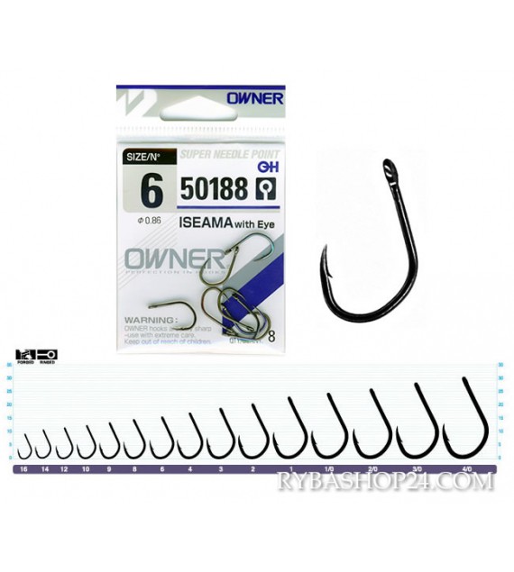 OWNER 50188 ISEAMA füles horog. Erősített kiképzésű, sötét színű, ponty vagy amúr horgászatához ajánlott horogtípus. Nagyobb méretei miatt nem csak általános feeder vagy fenekező, de bojlis horgászathoz is ajánlott.  Méretei: 1, 2, 3, 4, 6, 8, 9, 10, 12, 14, 16