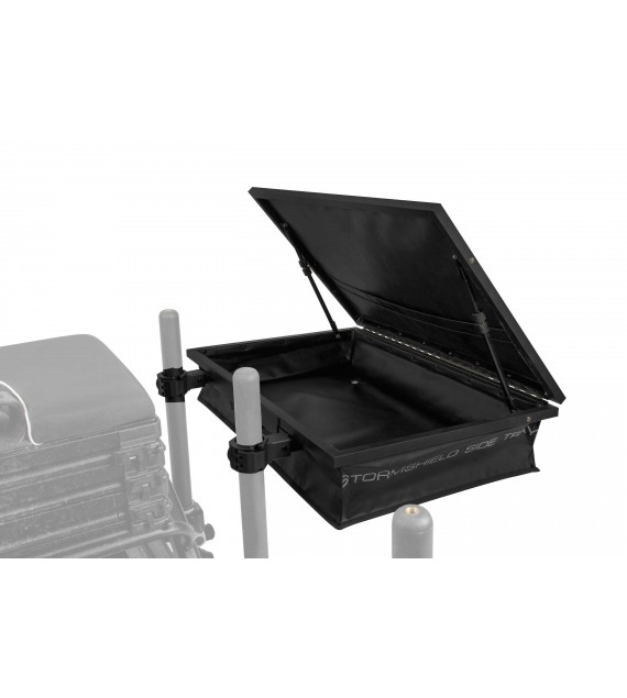 Az OffBox 36 Storm Shield oldalsó tálcában biztonságban tudhatjuk csalijainkat, függetlenül attól, hogy milyen időjárási viszonyok vannak a nap folyamán. A nagy EVA tálca sok csali számára alkalmas rakodótér, míg a teleszkópos támasztókarok lehetővé teszik a fedél szögének az időjárási viszonyoktól függően történő beállítását. Amikor a fedél nyitva van, belül további zsebek találhatók, amelyek belsejében olyan eszközöket tárolhatunk, mint az előketartó dobozok, ollók fogók, vagy akár a mobiltelefon. Az EVA anyaga könnyen törölhető vagy öblíthető minden horgászat után.