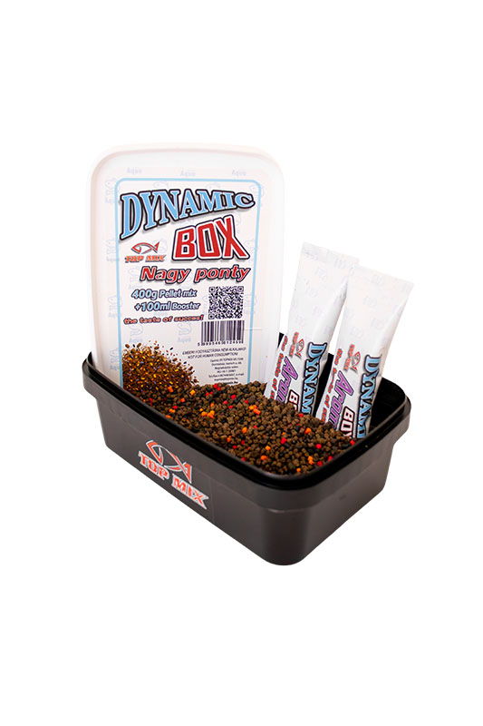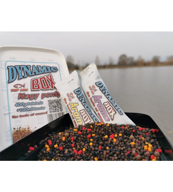 A Dynamic Box-ban halas, tehát fehérjedús és szénhidrátban gazdag pelletek speciális keveréke található, a 400g pellet keverék horgászathoz való előkészítéséhez szükséges 100ml aroma mennyiséggel. Az aroma tasakot kibontva, annak tartalmát rá kell önteni a pelletre, majd jól összerázni és 10-15 percet állni hagyni. A keverék ezután használható, kosárba tölthető.