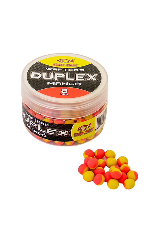 A Top Mix Duplex wafters termékcsalád tagjai azoknak a feeder horgászoknak készültek, akik szeretik az attraktív oldódó csalikat. Kikönnyített pelletek, de épp csak annyira, hogy fine tüske mellett #14 horgokkal is használhatók legyenek a legkisebb, 8-as méretek. 8mm, 10mm és 12mm méretekben kapható minden íz. Oldódási képessége intenzív, "nyitott csali", hogy az aroma mellett beltartalmi értéke is csalogassa az oda tévedő halakat. Dupla színösszeállítás mellett ugyanazzal a csalival különböző fényviszonyok mellett is horgászhatunk, egyszerűen a másik oldalról tűzzük fel a csalinkat, máris más tónusú, de ugyanolyan színvilágú csalink lesz a horog mellett.